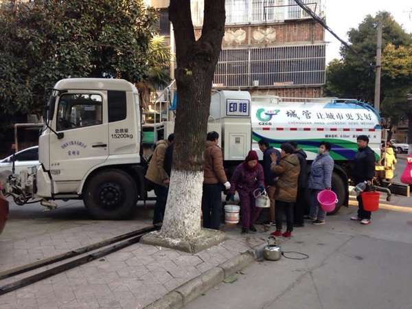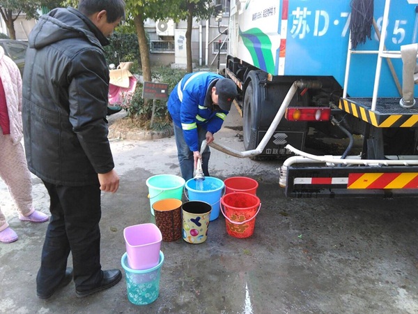 受极寒天气影响,我区出现严重冰冻,多个社区居民家中水管被冻。为保障居民生活用水,1月26日上午6:30,天宁环卫处迅速组织了13辆送水车,为分布在17个社区的26个送水点进行送水,以解居民燃眉之急。
