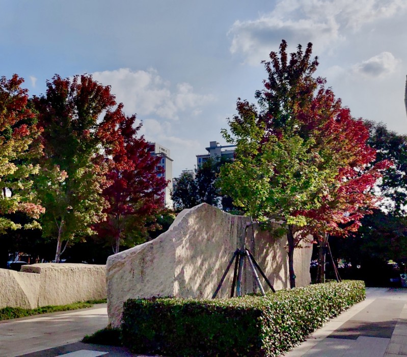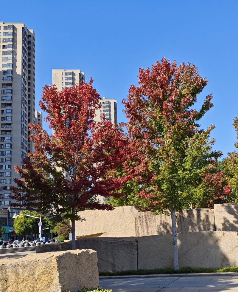尤其是靠近南门的几棵美国红枫,已褪去翠绿,换上鲜红、橙红、金黄的“盛装”,为秋日增添了一抹灵动的色彩,目之所及皆是“霜叶红于二月花”的诗意景致。阳光透过枝叶洒下,叶片在光影中呈现出深浅不一的红色调,微风拂过,枫叶簌簌飘落,地面也铺起一层“红地毯”,不少市民驻足观赏,或举起手机拍摄美景,或与家人朋友在枫树下合影留念,享受秋日限定浪漫。