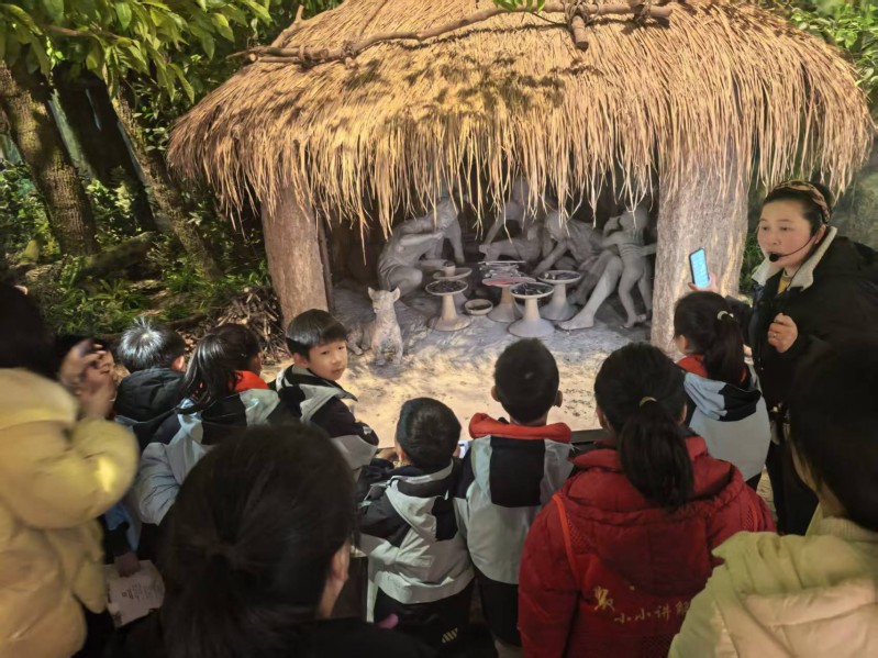 研学之旅的首站是圩墩遗址博物馆。步入馆内,史前先民智慧的结晶扑面而来,运用榫卯技术搭建的干栏式房屋复原场景古朴逼真,承载生活印记的各类陶器、打磨精细的石器、用于纺织的纺轮与缝制衣服的骨针整齐陈列。在讲解员生动细致的解说中,同学们屏息聆听、驻足观察,书本上抽象的“马家浜文化”瞬间变得生动具体,先民们改造生活的创造力与生命力,在文物的静默诉说中深深烙印在孩子们心中。