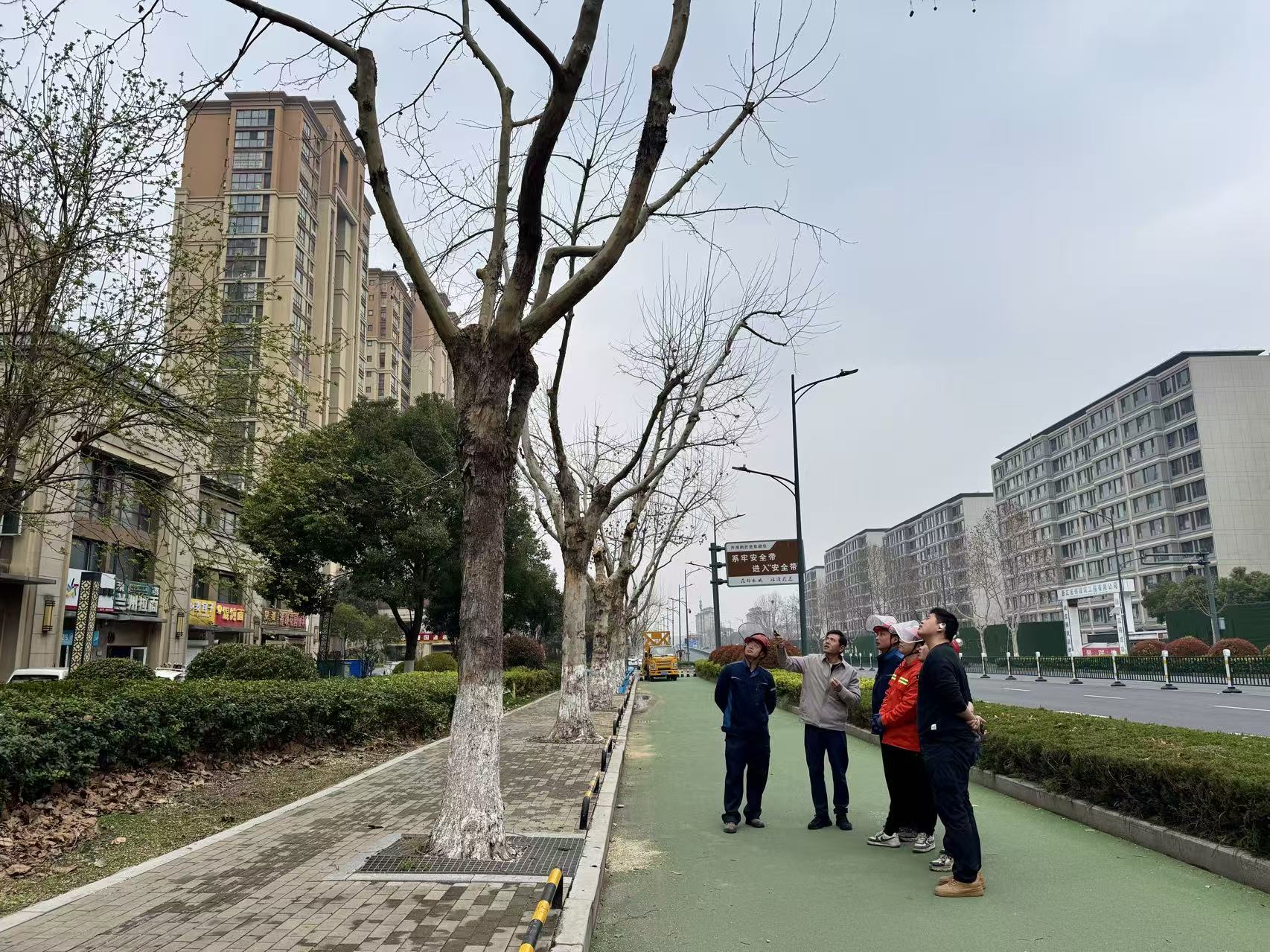 在修剪现场,工作室树木修剪专家赵鑫围绕冬季修剪要点,重点示范讲解悬铃木自然开心形的修剪手法,从枝条疏剪、侧枝布局、冠幅通透等方面进行细致指导,着重强调树形匀称、通风透光的养护要求,并对现场修剪中存在的问题进行纠正。